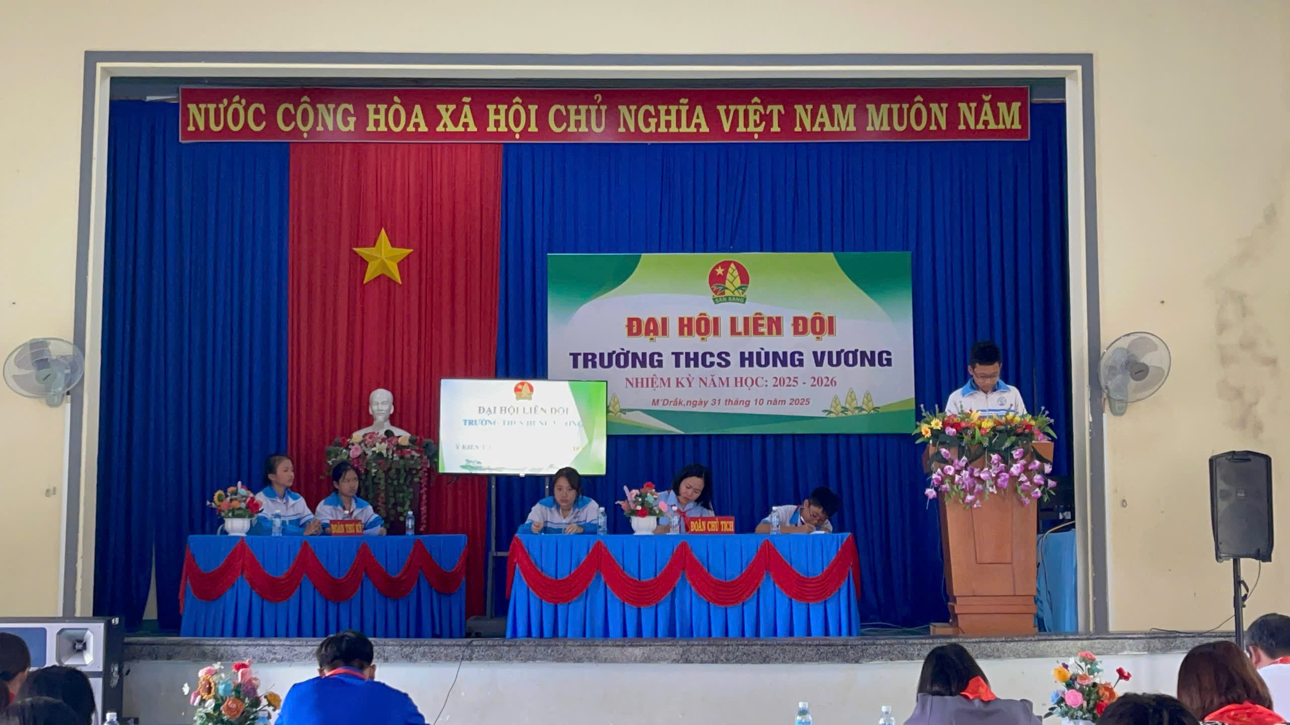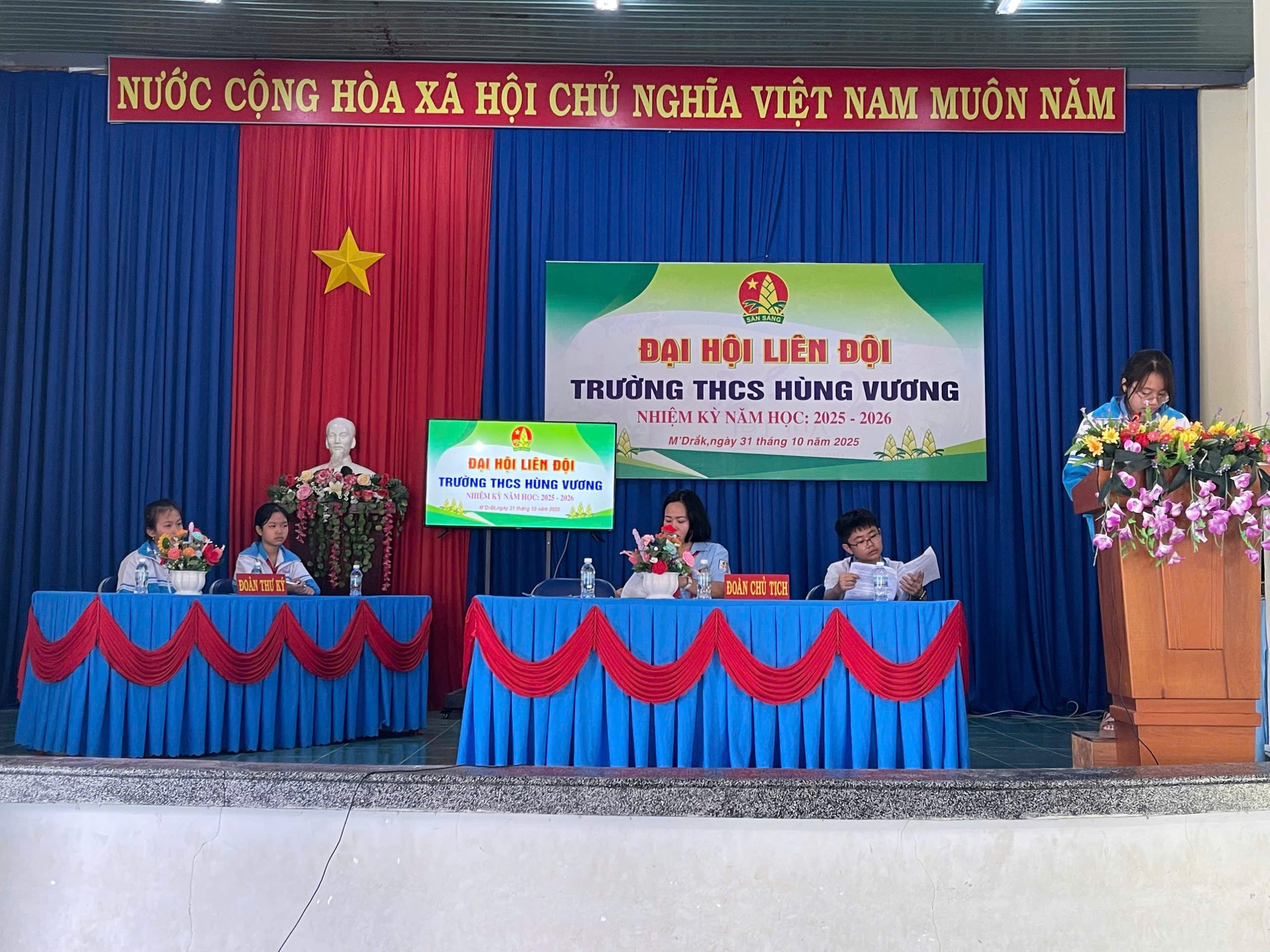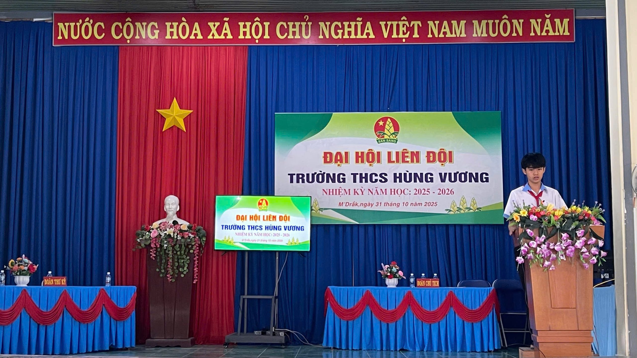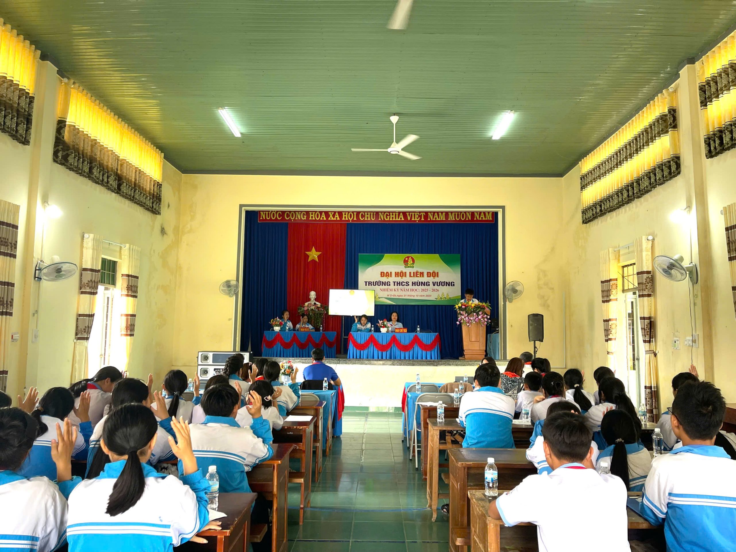 Đại hội Liên đội Trường THCS Hùng Vương nhiệm kỳ 2025 – 2026 đã diễn ra trong không khí trang trọng, phấn khởi và thành công tốt đẹp. Đây không chỉ là dấu mốc quan trọng trong hoạt động Đội của nhà trường, mà còn là nguồn động lực to lớn để mỗi đội viên tiếp tục thi đua học tập, rèn luyện, thực hiện tốt 5 điều Bác Hồ dạy, góp phần thực hiện thắng lợi nhiệm vụ năm học mới”.