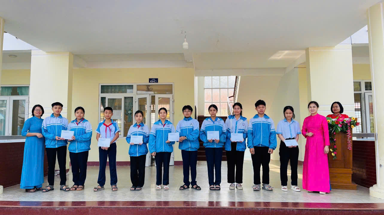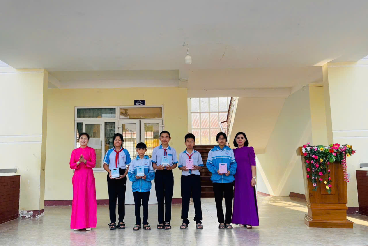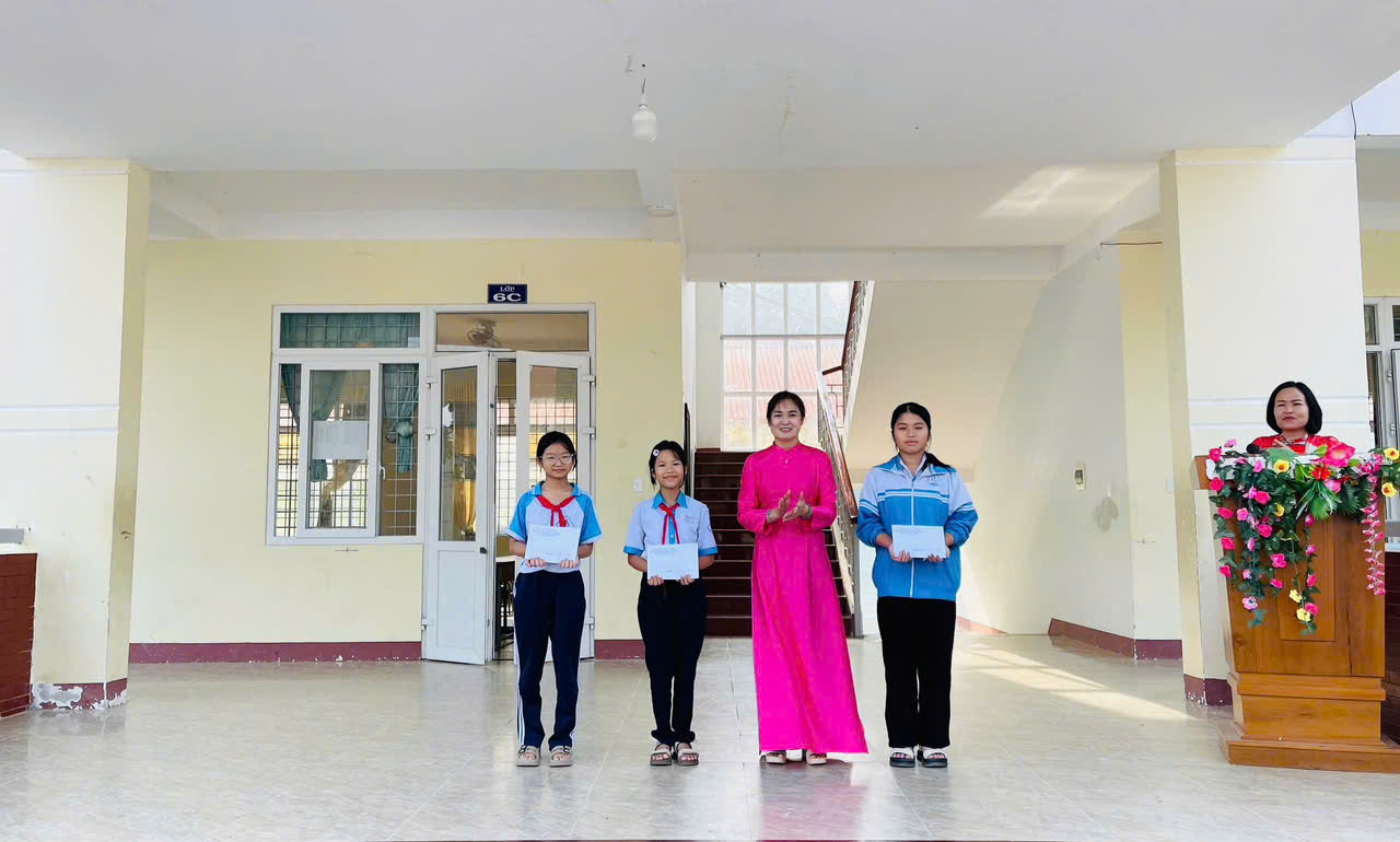 Cô Đỗ Thị Loan – Bí thư Chi bộ, Hiệu trưởng Nhà trường trao giải Nhất cho Vũ Ngọc Trà My (lớp 6A – giữa); Trần Thị Thảo Nguyên (lớp 6B – bên trái) và Nguyễn Đoàn Minh Thư (lớp 9A – bên phải).