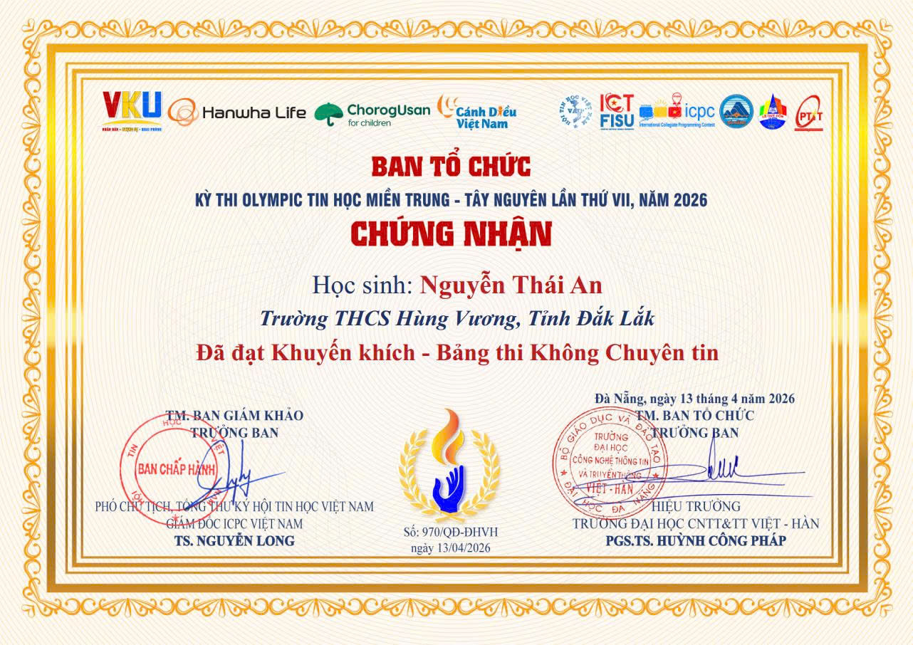TỰ HÀO HỌC SINH TRƯỜNG THCS HÙNG VƯƠNG ĐẠT THÀNH TÍCH CAO TẠI KỲ THI OLYMPIC TIN HỌC MIỀN TRUNG – TÂY NGUYÊN LẦN THỨ VII, NĂM 2026